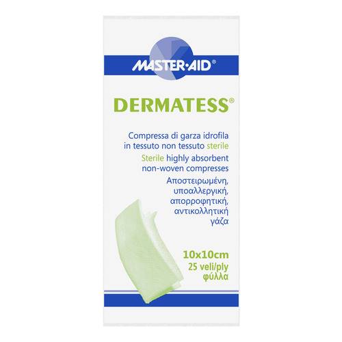 MASTER•AID DERMATESS Dispositivo medico CE 0373. Compressa morbida di garza sterile in tessuto non tessuto, monoestensibile. Grazie al tipo di tessuto non si attacca alla ferita, non spela, non si sfilaccia.