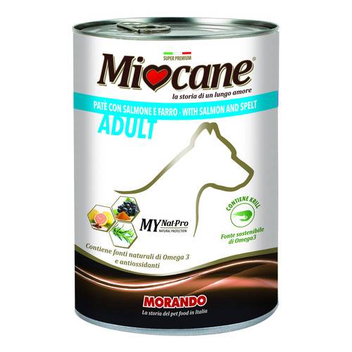Carni e derivati, pesci e sottoprodotti dei pesci (salmone 5%), cereali (farro 4%), molluschi e crostacei (krill 0,4%), sostanze minerali.
