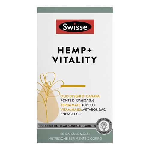 Integratore alimentare con olio di semi di canapa, vitamine ed estratto di yerba mate.