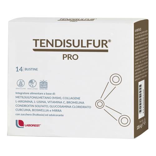 Metilsulfonilmetano (MSM), fruttosio, collagene idrolizzato suino, L-arginina, L-lisina cloridrato, vitamina C (acido L-ascorbico); acidificante: acido citrico; bromelina da gambo di ananas e.s. [Ananas comosus (L.) Merr., maltodestrine] 2.500 GDU/g; glucosamina cloridrato, condroitin solfato bovino, aroma, Bosliq [Boswellia carteri Birdw (gummi-resina) e.s. supportato su proteine di riso] tit. in acido cheto-boswellico (AKBA), curcuma rhizoma e.s. (Curcuma longa L.) tit. in curcuminoidi; agente antiagglomerante: biossido di silicio; Myrliq [Commiphora myrrha (Nees) Engl. (oleum-gummi-resina) e.s. supportato su proteine di riso] tit. in furanodieni; edulcorante: sucralosio.